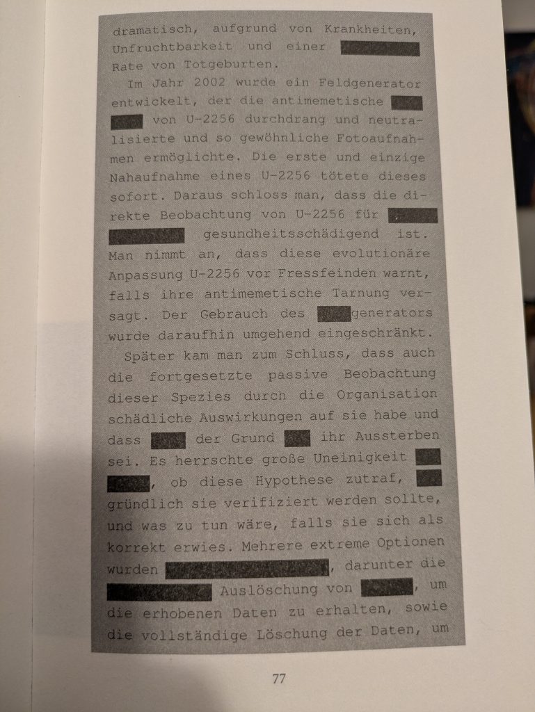 Außerdem mag ich, dass auch die Form des Buches dem Thema gerecht wird. Bereits in der SCP-Story hat Hughes Details zu verschiedenen Unbekannten als Akten integriert, wie man sie sich eben vorstellt: Objektnummern, Beschreibungen etc. Besonders toll daran: Wenn es thematisch passt, sind gewisse Stellen in den Akten „geschwärzt“. Und zwar nicht, weil da jemand Angst vor Geheimnisverrat hat und den Zensurstift zückt, sondern weil die Unbekannten eben antimemetisch arbeiten und so einfach gewisse Lücken im Gedächtnis beim Lesen entstehen. Das heißt: Auch wenn das Wort noch in der Akte steht, kann das Gehirn es in diesem Moment einfach nicht aufnehmen und verarbeiten. Das ist ein kleines Detail, aber es ist großartig!